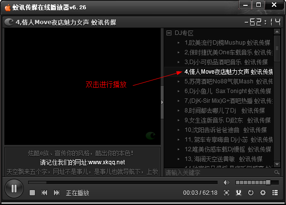 1、软件启动后会自动加载DJ音乐,加载完成后在右边列表中双击就可以播放。