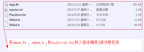 2.将smaa.fx , smaa.h ,和injector.ini放入狙击精英3游戏根目录,dxgi.dll放入根目录中的bin文件夹