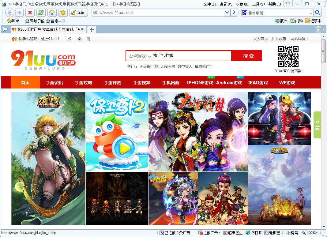 2、安装完成后启动UU手游浏览器,就会自动进入91uu手游页面,点击要玩的游戏就可以进入下载并查看相关游戏信息