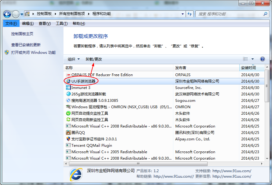 在列表中找到UU手游浏览器,选中之后点击【卸载/更改】进行卸载