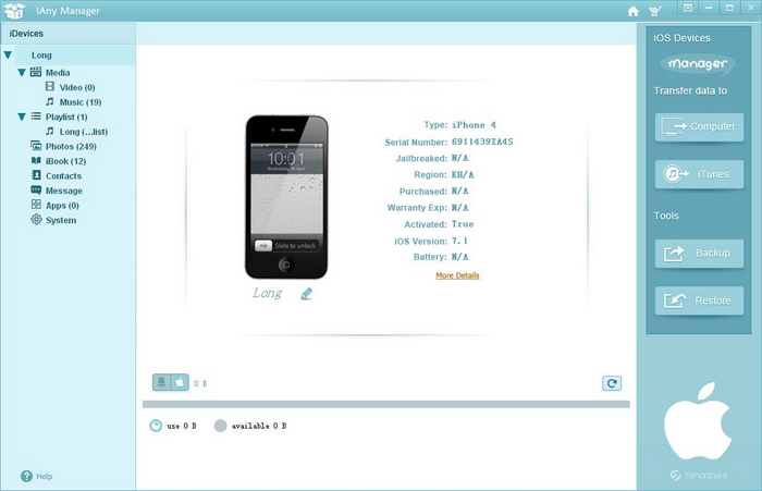 iAny Manager是一款iOS设备(iPhone/iPad/iPod/)数据管理软件,相比苹果官方的管理工具iTunes来说,这个软件算是非常好用了。iAny Manager具有对iOS中的数据进行传输、管理、同步、备份、还原等功能,是最简单的iOS设备管理工具。