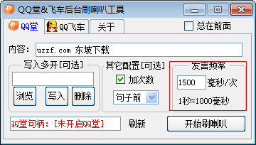 大家在玩游戏的时候经常会遇见那些不停刷喇叭的玩家,用手动来刷喇叭的话非常的无聊费力气,QQ堂飞车后台喇叭工具是一款用于QQ堂和QQ飞车后台刷喇叭的辅助工具,使用者通过本工具能够自动刷游戏中的喇叭。