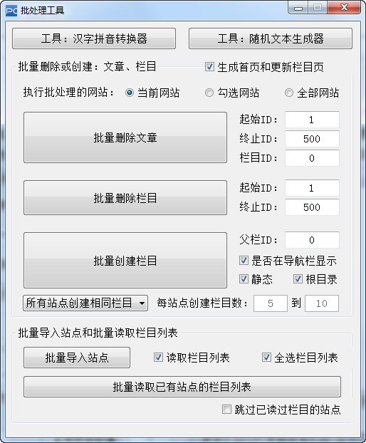 右上角的批处理工具中有文字拼音转换器、随机文本生成器、批量删除文章等功能