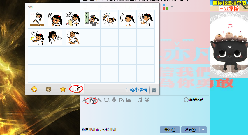 3、这时你可以随便找个能聊天的网友,打开对话窗口,这时在打开表情选择,这里面就会有刚才下的哪些表情。