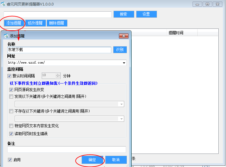 3、这时在点击【添加提醒】,在这里添加新的网站,点击【确定】