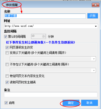 4、这时如果你以前的网站名或网址有变动,可以点击修改提醒,在新的对话框中输入新的信息,点击【确定】