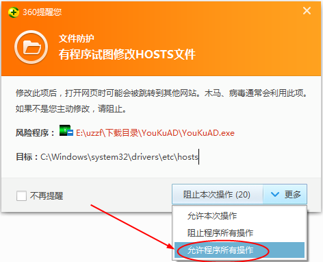 3、360等安全软件会拦截hosts文件修改行为,请选择【运行程序所有操作】