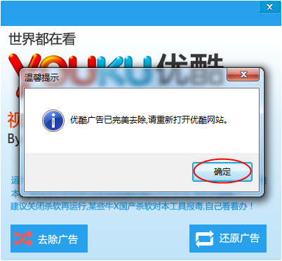 优酷视频广告去除插件是一个绿色免费的优酷去广告工具,可去除优酷土豆的片头广告,支持全系统。原理是通过修改hosts文件来屏蔽广告域名,达到去广告的目的!有了这款优酷去除广告软件,就可以安心的享受绿色无广告的视频环境了。