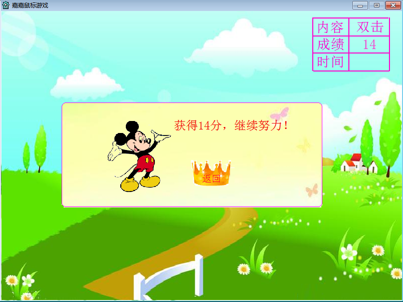1、单击:在草地上不断出现许多米老鼠,用鼠标光标对准它时,光标会变成了手形,马上单击左键。单击成功,在屏幕上的右上角显示成绩和剩余的时间。每单击一次成功加1分, 练习时间是1分钟。