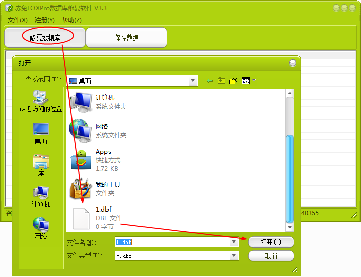 1、该软件为绿色软件,下载解压后可以直接打开【赤兔FOXPro数据库修复软件.exe】使用