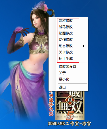 凉宫修改器是为游戏真三国无双打造的一款游戏修改器,玩家可以通过这款辅助工具来对游戏内的贴图,人物,战马等等进行修改。这款游戏修改器提高了玩家游戏的乐趣,让玩家加入到游戏的制作中来,真正做到“玩游戏”。