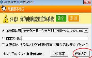 加强保护模式:所生成的保护程序会隐藏进程 不会被其他程序结束,也不能自主结束掉每次锁定时程序会生成一个很小的主页保护程序,如果有杀毒软件话会有勿报的可能请放心加到信任里(不再提示),只要加到杀毒的信任里,可无视任何主页修改程序