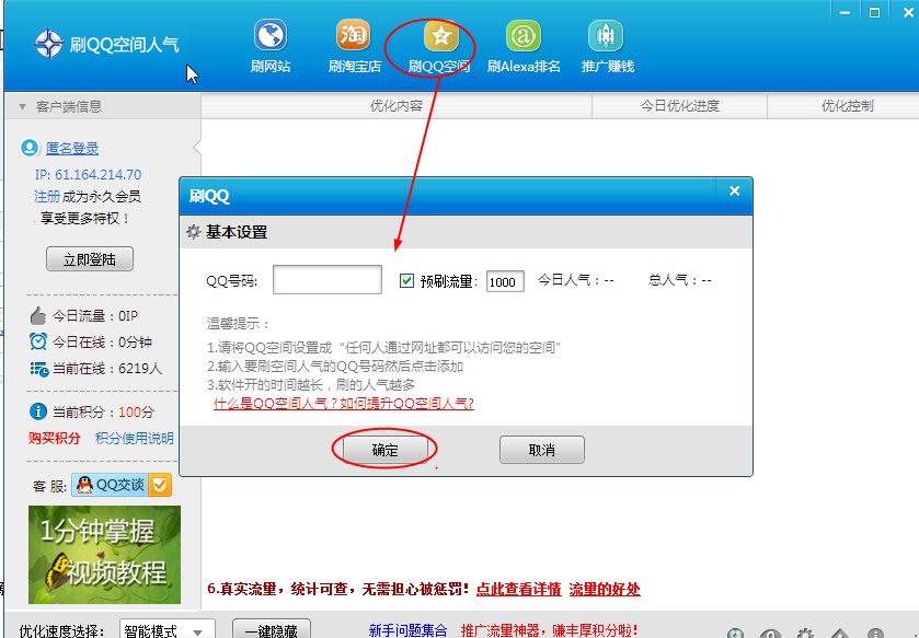 3、在选择“刷QQ空间”,在弹出来的对话框中,输入自己的QQ号码,在点击【确定】