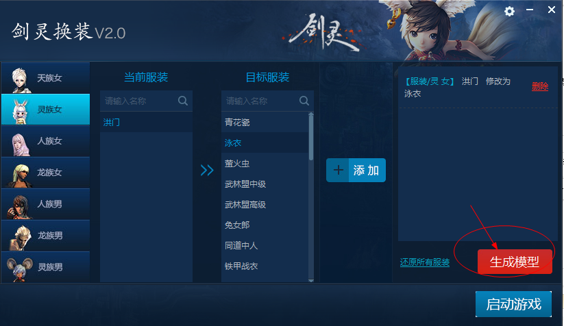 2、打开剑灵换装工具,选择当前服装,再选择目标服装名后,点击【添加】;