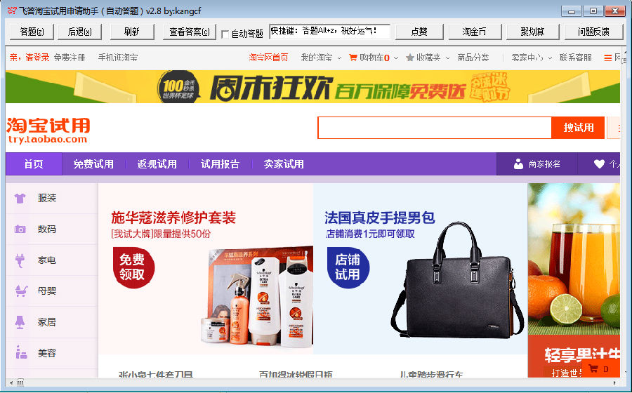 想试用淘宝里面的宝贝吗?下载飞答淘宝试用申请助手吧,它能帮您申请试用哟,简单方便。飞答淘宝试用申请助手是一款目前非常流行的淘宝试用辅助小工具。该款淘宝免费试用申请软件界面简洁、操作简单,能在用户申请试用的时候,自动回答系统提示的问题,让您避开大量繁琐的步骤,快速成功申请。