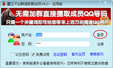 2、使用测试账账号登录,功能有一定的限制,测试账户一次只显示100至2000个群,和100至1000个QQ号码,购买后即可正常提取。