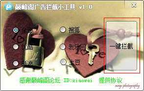 每次在网上看各种在线视频的时候大家经常会遇见各种又臭又长的各种广告,严重的影响了大家看视频的心情,巅峰阁广告拦截小工具是一款简便实用的广告拦截工具。使用者通过本工具能够快速的进行各种视频网站广告的拦截。
