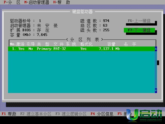 当我们进入到“硬盘驱动器”的界面时,首先看到的是引导系统进入u启动主菜单界面的u盘,而不是电脑的硬盘,只需要按下“F7-下一硬盘”的按钮或者是直接按下F7按键即可看到电脑硬盘的分区情况;如下图所示: