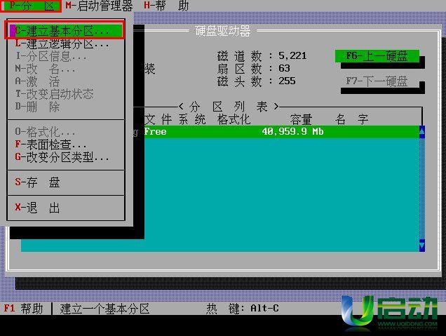 -->"删除"(Delete)-->把硬盘上的所有分区都删除掉,最后归回一个40.0GB的自由空间(Pri/Log Free)。