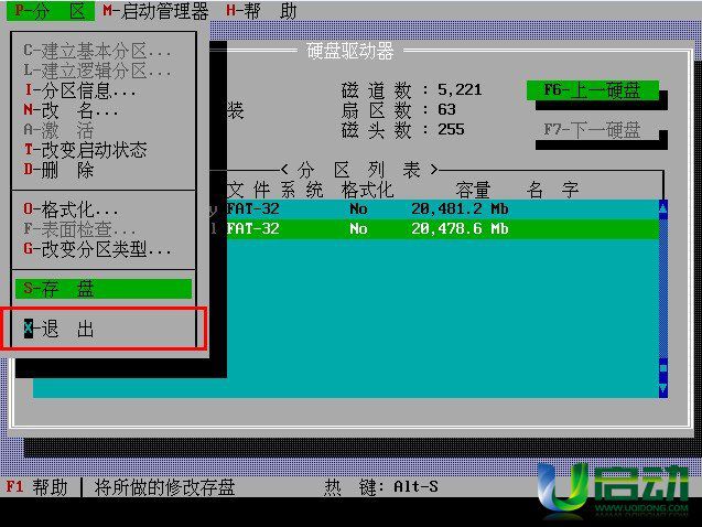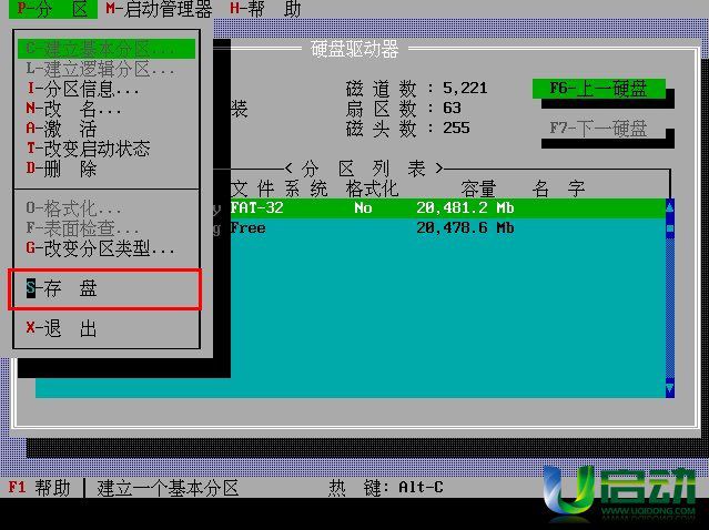 分区建立完成后需要将其存盘,只需要选择相应的分区后,点击左上方的“P-分区”,在菜单选项中选择“S-存盘”即可;如下图所示: