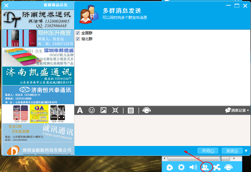 7、这些设置完成,就可以点击【多群发布消息】来发布自己的一些消息给群友