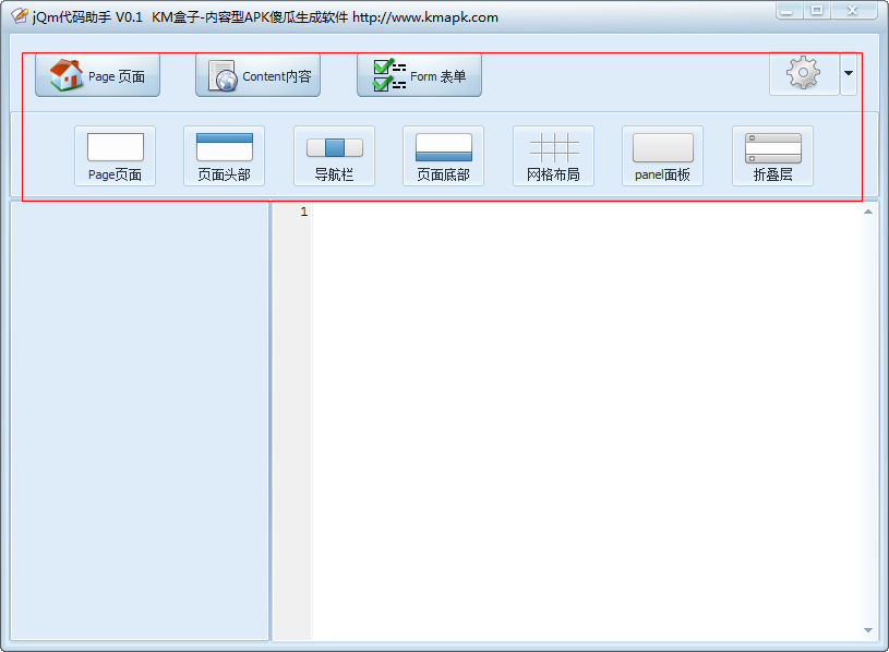 jqm代码助手是为方便jquery mobile中文学习的一款代码自动生成工具,将常用的组件分类成page页面、content内容、Form表单,其中page页面包括header头部、navbar导航、footer底部、grid网格、panel面析、collapsible折叠层,content内容image图片、audio音频、video视频、button按钮、link链接、listview...