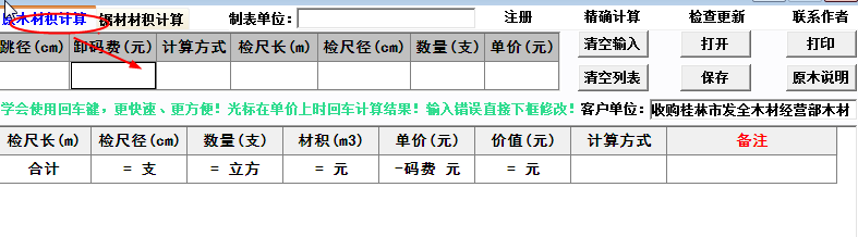 7、单支计算:价格=数量*单价,不按材积立方计算价格,在单支计算中输入1或0则按单支计算价值,输入其他都是按材积立方计算价值,当然材积还是计算在总材积内的;(如:当在单支计算输入1时,数量输入8;单价输入20;那么回车后下表框价值显示为160);
