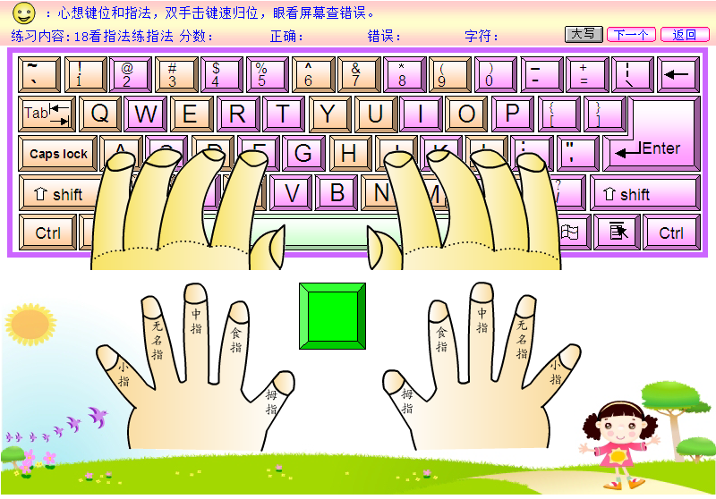 4、点手指练习。懂得指法分工是学习打字成功第一步。13点手指练习是根据键盘上绿色字母键的提示,用鼠标单击相应的手指,点击正确的手指才能显示下一个字母键。