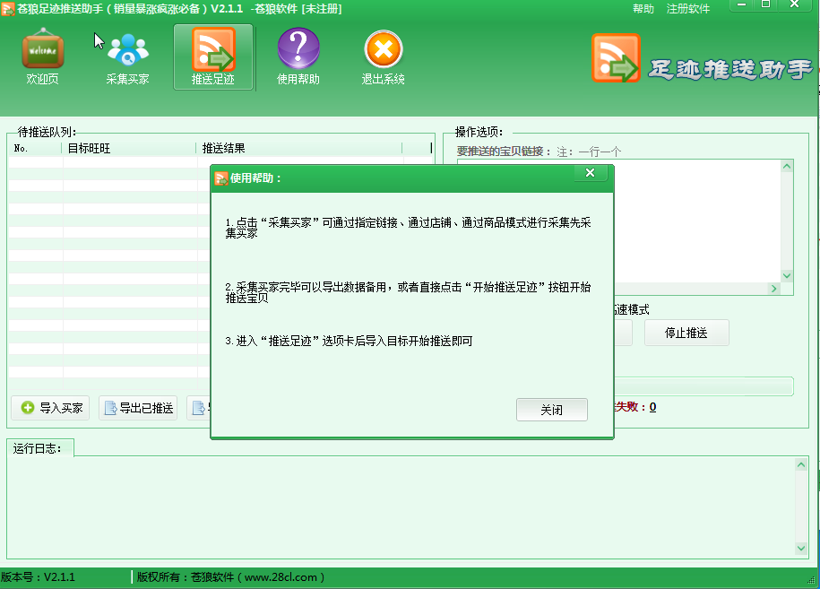苍狼足迹推送助手是一款功能非常强大而且非常实用的软件,它能将卖家的宝贝推送到陌生买家我的足迹之中。是淘宝卖家必备的神器。