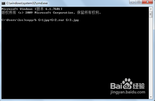 如下图如入程序指令【copy/b※g:1.jpg+g:2.rar※g:3.jpg】(※代表一个空格,括号不用输)后按回车键