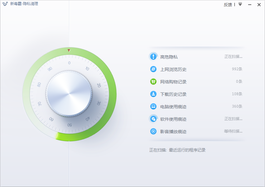最新版的新毒霸开发版中增加了一个隐私清理功能,可以清理掉一些日常上网和使用电脑过程中留下的隐私记录,包括“高危隐私”、“上网浏览器历史”、“网络购物记录”、“下载历史记录”、“电脑使用痕迹”和“影音使用痕迹”等。