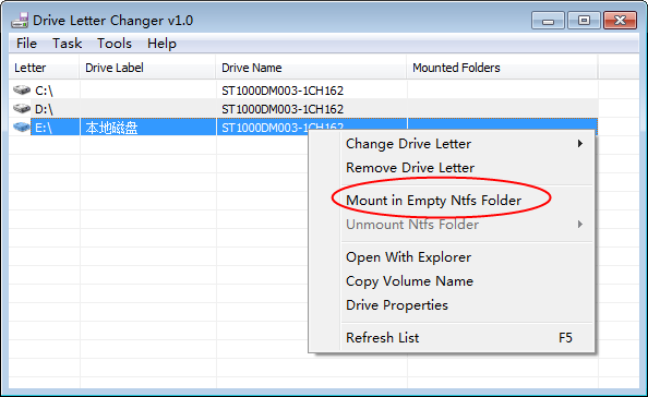 Drive Letter Changer 还有一个加载驱动器到空白 NTFS 文件夹的功能,点击鼠标然后选择 「Mount in Empty NTFS Folder」 就可以了。它允许你将当前整个驱动器加载到一个指定的文件夹中,那么以后你只要访问这个文件夹,就等于是访问该驱动器了。