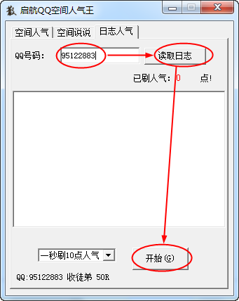 3、刷日志人气:输入你的QQ号然后点击【读取日志】,然后点击【开始】刷日志人气