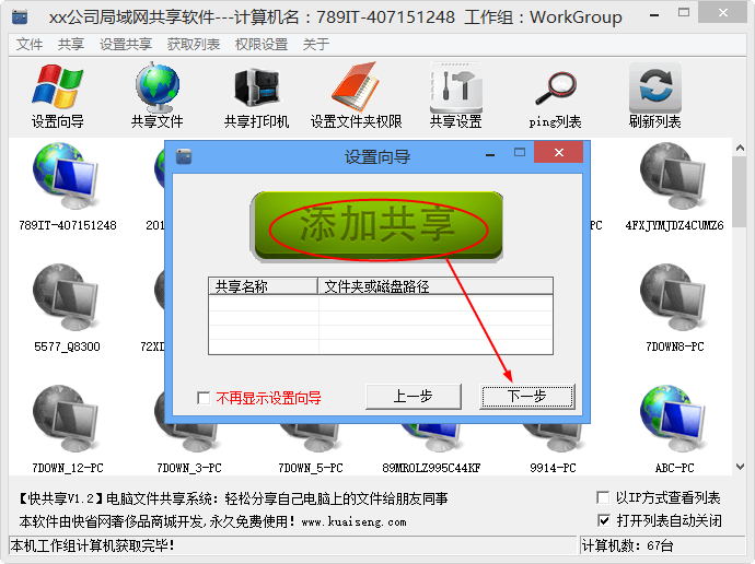 快共享是一个绿色免费的电脑文件共享专家,支持XP,WIN7,WIN8电脑之间文件共享操作,可以帮你快速开启局域网的共享功能,你可以一键添加要共享的文件,更便捷更省心!