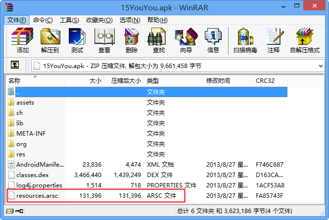 1、先把apk文件用WinRAR打开,然后把里面的arsc文件拖出来