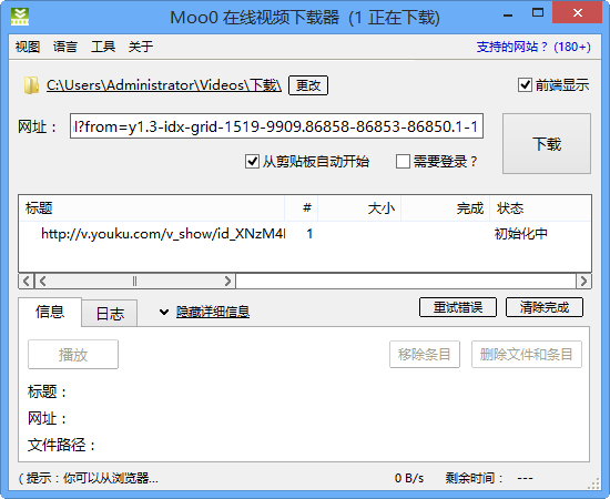 Moo0在线视频下载器是一个免费的视频下载软件,支持180个视频网站的视频免费下载,使你能够轻松地保存你最喜欢的在线视频到本地。