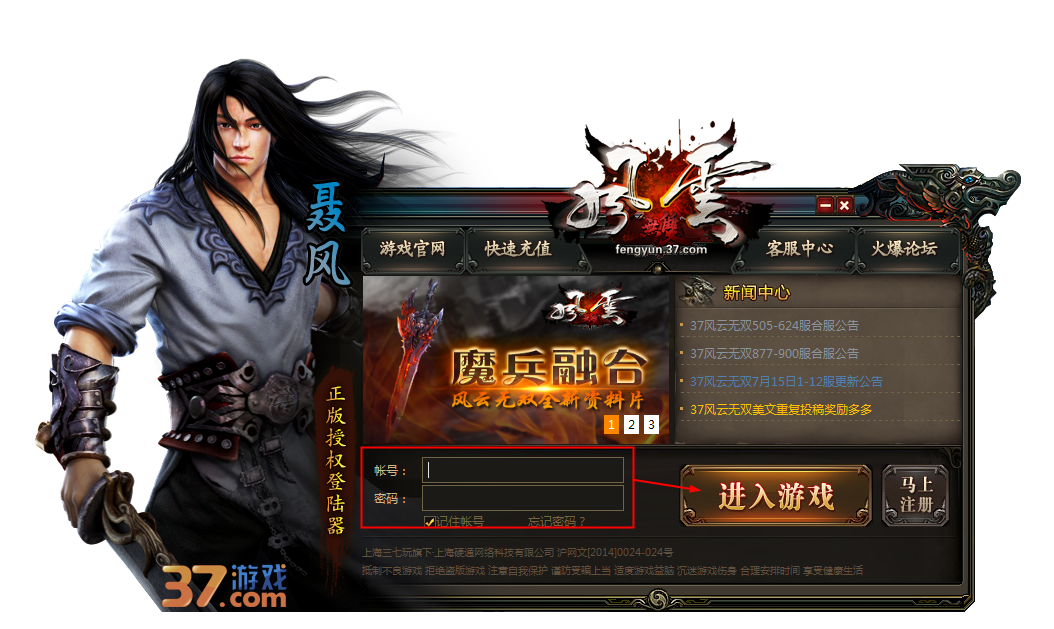 3、安装完成后运行37风云无双登陆器,然后使用37玩账号登陆游戏即可