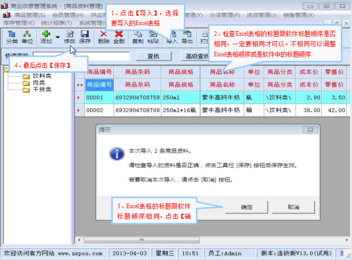 ②、如果觉得手工每一条输入麻烦,可以通过Excle表格导入方式批量录入商品资料,如图所示