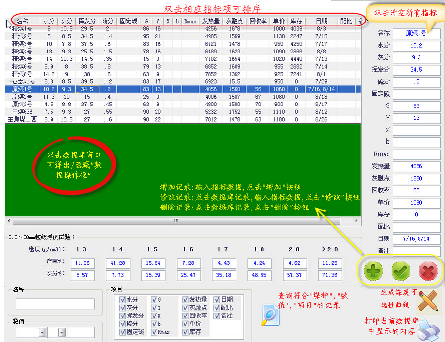 (7)煤炭可选性:绘制、打印煤炭可选性曲线,以及查询指定灰分下的可选性数据(沉物产率、浮物产率、基元灰分、分选密度、可选等级等)。