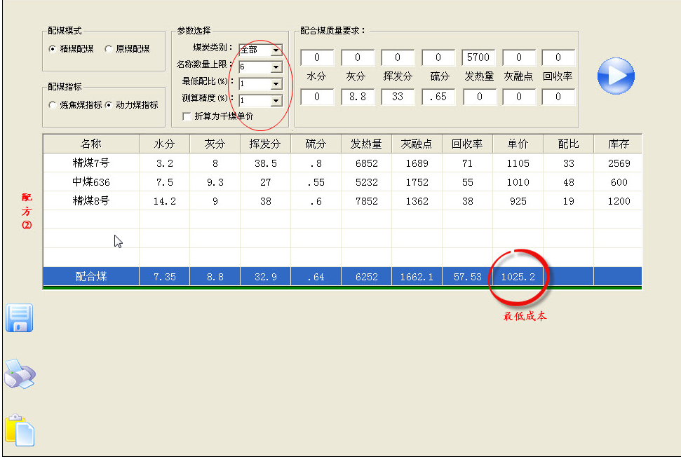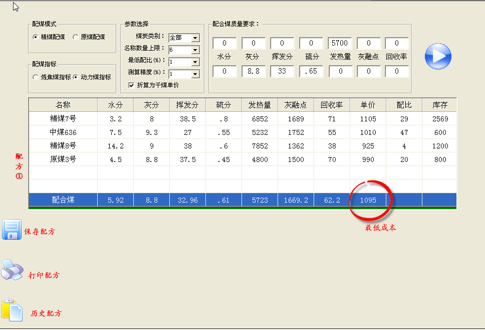 软件根据客户要求的配合煤质量指标(灰分、挥发分、硫分、G、Y、发热量、灰融点、回收率),自动将“煤炭数据库”中库存大于0的煤进行组合,找出成本最低的配方