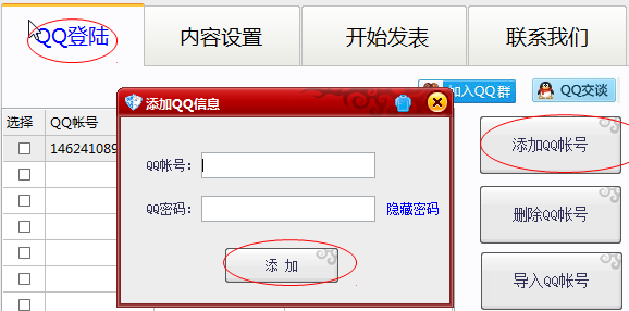 6、添加、删除发表者QQ帐号和密码,单击将登录空间。