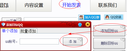 5、这时在选择“开始发表”,里面的“添加目标qq”,这时就输入你要评论留言的QQ号码,然后点击【添加】