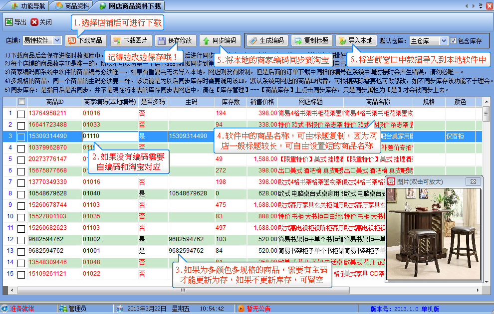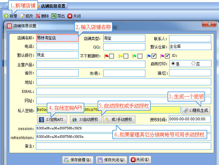 第1步:建立网店,一套软件可以管理多个淘宝店铺,给店铺授权API应用接口,以便下载及同步数据。