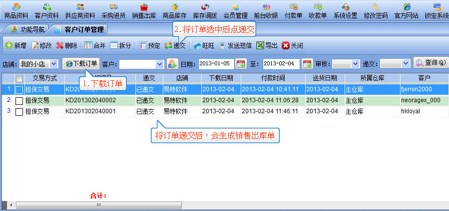 第3步:下载订单,【销售管理】--【订单下载】打开如图所示的窗口,也可以从顶上菜单【销售管理】---【客户订单管理】功能相同。