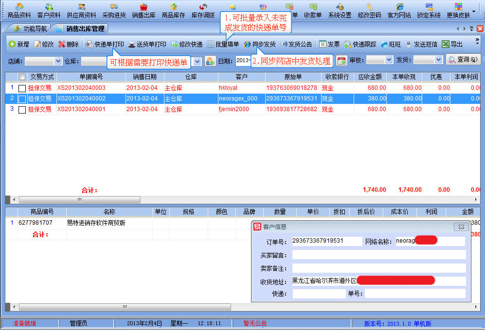特色功能:可下载淘宝已付款未发货订单数据进软件,同买家同地址订单自动合并为同一张订单,也可以手动合并及拆分,确定无误后,批量递交生成发货单,可批量打印送货单,快递单,自动完成淘宝发货等!