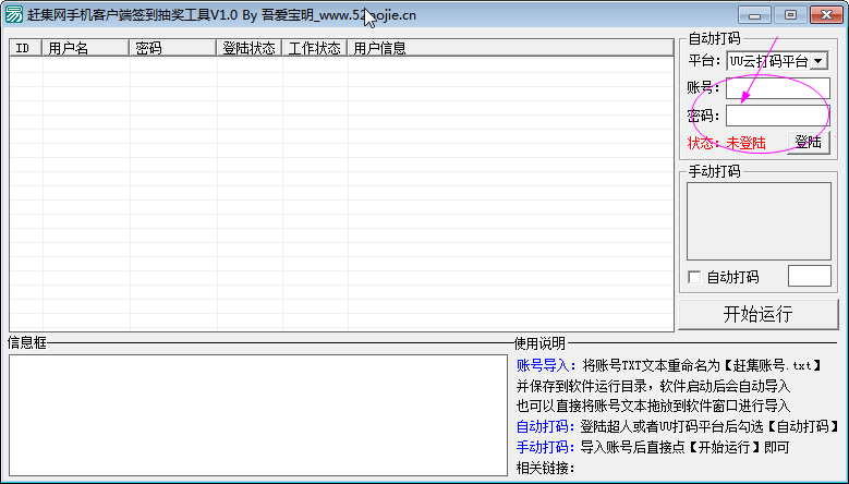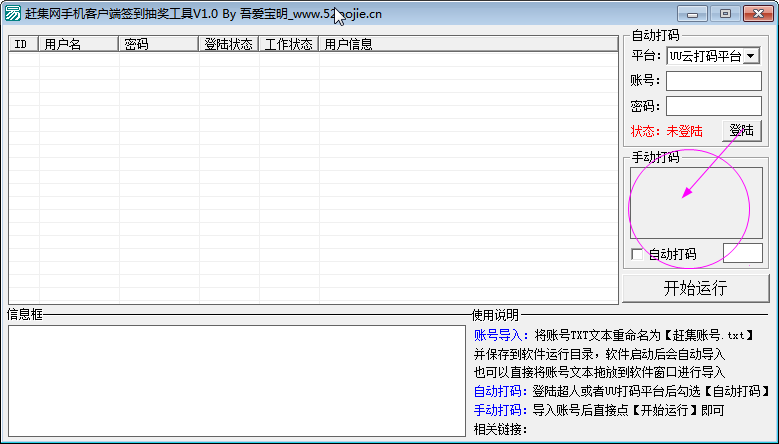 4、手动打码:成功导入账号后直接点击【开始运行】循环输入验证码即可