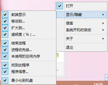 3、右键点击Moo0窗口菜单增强工具托盘图标,选择【显示/隐藏】可以设置要显示的功能