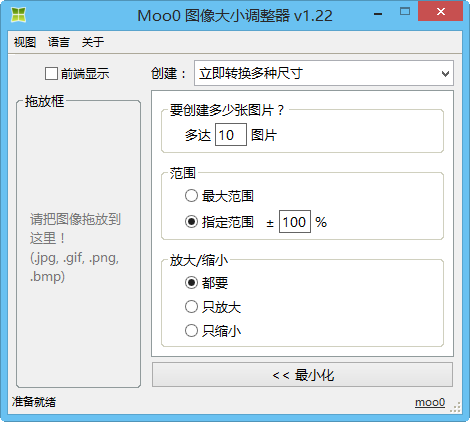Moo0图像大小调整器是一个免费的图片大小修改器,他可以批量的修改图片大小,便于将图片放在一些特殊的地方使用。该软件非常易用,你只需把你的文件拖进软件界面,支持jpg、gif、png、bmp和ico等图片格式。当你在设计时经常疑惑选择什么大小的图片的时候,这个软件可能非常强大。