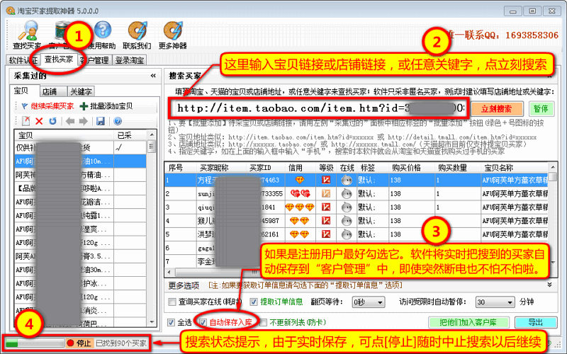 本软件独家提供一个买家数据库及其管理工具,可将不同时间采集的买家信息保存到买家库,支持多分类形式(可设置多个分类标签),并自动过滤重复买家,全网独有。同时你还可以在该客户管理工具中检测买家在线状态、过滤买家、按需导出所需要买家数据(如高信誉的买家或在线的买家等),客户管理中的买家一定都是不重复的。