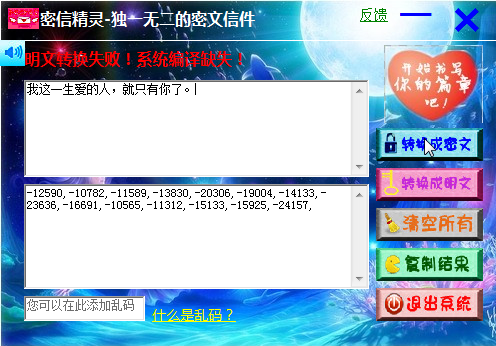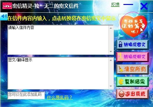 2.最大的特点是实现了用户自主添加乱码,这样就生成自己独一无二的密文信件了!目前软件还在不断升级完善中。
